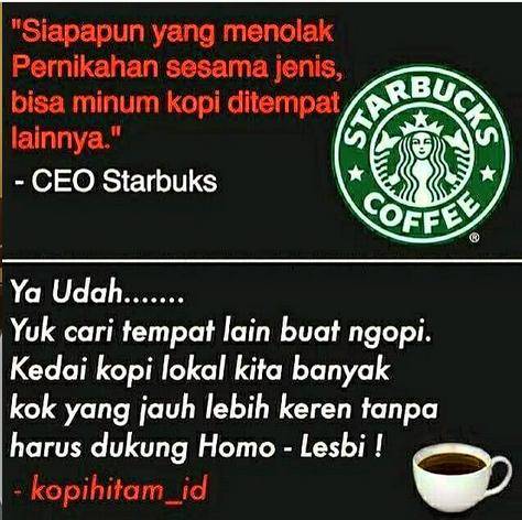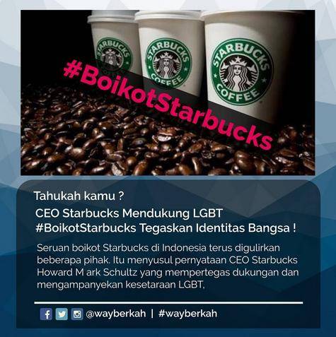 Dikarenakan mendukung pernikahan sejenis, pro gay, seperti dilansir oleh Dailymail.co.uk per 2/7/17, Starbucks menuai kecaman. Hal ini ramai diperbincangkan, salah satunya di jejaring instagram dengan hashtag #boikotstarbucks yang dilansir hingga 2,448 posts per 8/15/2017, dan berbagai hashtag lain semisal: #boikotstarbuckscoffee. Beberapa lansiran terpampang sebagai berikut: